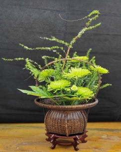 在杜凌的专业讲授与园艺所花卉研究室副研究员许红娟的辅助指导下,参训职工热情洋溢,纷纷动手实践。活动现场花香四溢,气氛热烈而专注。经过一番精心制作,每位参与者都独立完成了属于自己的盘花作品,这些作品形态各异,意趣盎然,或端庄大气,或清雅秀丽,充分展现了学员们对中式插花艺术的独特理解与领悟,现场洋溢着满满的成就感与喜悦之情。